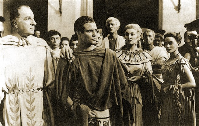 Луис Кахерн (Цезарь), Марлон Брандо (Марк Антоний), Грир Гарсон и Дебора Керр в фильме Джозефа Манкевича «Юлий Цезарь». 1953 год.