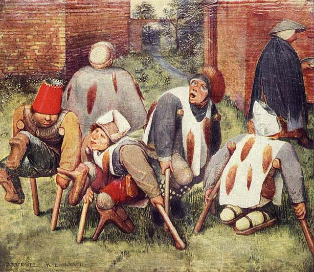 Питер Брейгель-старший. Калеки. 1568. Лувр. Париж. Глубоким трагизмом наполнены многие Брейгеля. Одна из написанных в последние годы — «Калеки». Изувеченные тела калек прикрывают причудливые одеяния, напоминающие карнавальные костюмы.