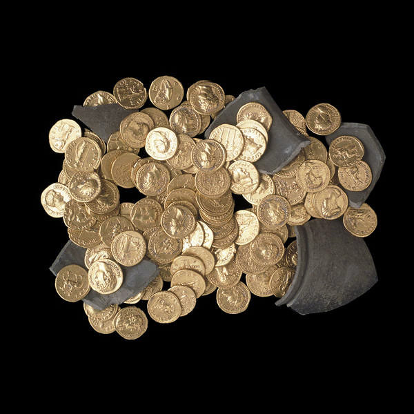 Клад из 126 золотых римских монет. Найден в Англии. 54-160 гг. н.э. Клад эквивалентен сумме, которую мог получить солдат того времени за 10, 5 лет службы.