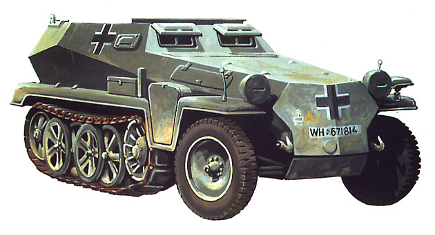 С июня 1941 года легкий бронетранспортер Sd Kfz 250 начал поступать на вооружение вермахта. Шесть разных фирм произвели до конца войны более 6600 таких БТР двух модификаций. Компоновкой (двигатель и ведущее колесо переднего расположения) Sd Kfz 250 походил на средний бронетранспортер. В ходовой части он имел 4 расположенных в шахматном порядке катка на индивидуальной торсионной подвеске. Основное вооружение — один-два пулемета калибром 7, 92 мм.
