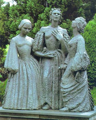 Памятник сестрам Бронте. Скульптор Дж. Хорнер. 1951. Установлен перед их домом-музеем в Хауорте, графство Йоркшир. Слева направо: Шарлотта, Эмили, Энн.
