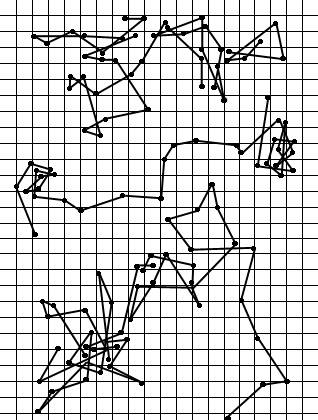 Траектории броуновских частиц (схема опыта Перрена); точками отмечены положения частиц через одинаковые промежутки времени.