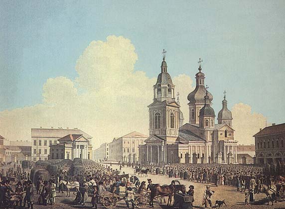 Сенная площадь (в советское время площадь Мира) в Петербурге существовала с 1730-х годов. Крестьяне из окрестных деревень привозили сюда на продажу сено (отсюда и название). На втором плане видны пятиглавая церковь Успения и стоящее поныне здание Гауптвахты с классическим портиком, построенное в 1818-1820 годах архитектором В. И. Беретти.
