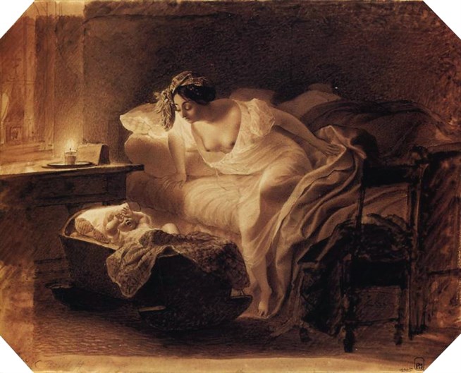 К.П. Брюллов. Мать, просыпающаяся от плача ребенка. 1831 год. Бумага, сепия. Местонахождение неизвестно.