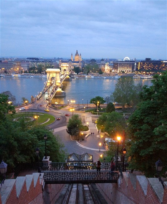 Вечерний Будапешт. Вид на мост через Дунай с фуникулера. Фото: А. Олешкевич