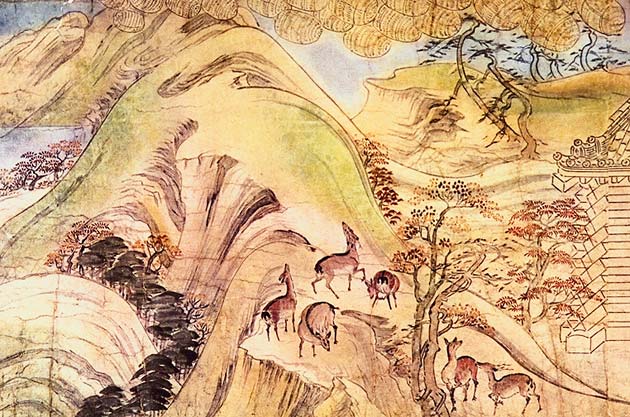 Одно из первых изображений природы в японской живописи. Фрагмент свитка «Сисисанэнги эмаки» эпохи Хэйан.