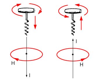 Правило буравчика: если буравчик с правой нарезкой ввинчивать по направлению тока (I), то направление вращения рукоятки совпадет с направлением напряженности магнитного поля (H).