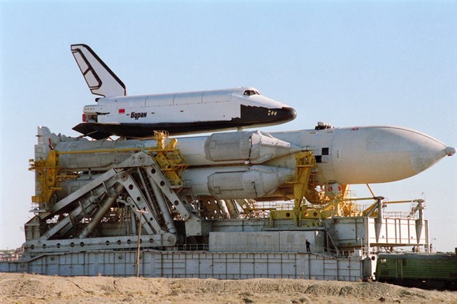 Байконур. Универсальная ракетно-космическая транспортная система «Энергия» с орбитальным кораблем многоразового использования «Буран» вывозятся на стартовый комплекс. Октябрь 1988 года. Снимок Альберта Пушкарева.