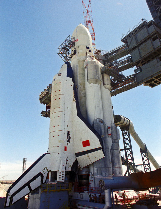Байконур. Универсальная ракетно-космическая транспортная система «Энергия» с орбитальным кораблем многоразового использования «Буран» на стартовом комплексе космодрома. Октябрь 1988 года. Снимок Альберта Пушкарева.