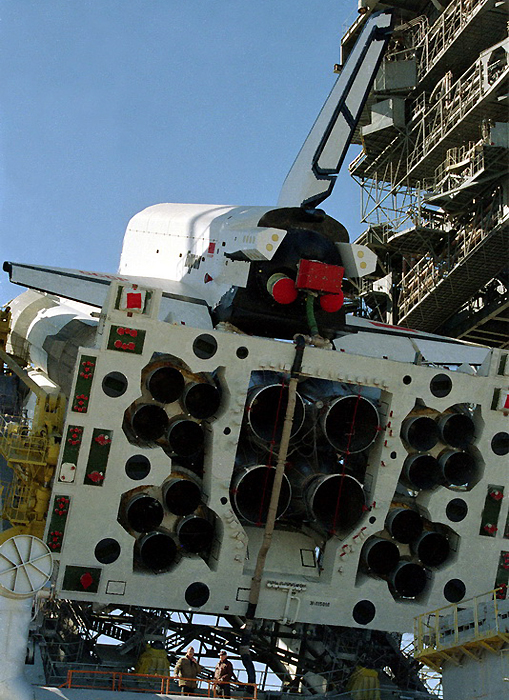 Байконур. Универсальная ракетно-космическая транспортная система «Энергия» с орбитальным кораблем многоразового использования «Буран» во время установки на стартовом комплексе. Октябрь 1988 года. Снимок Альберта Пушкарева.