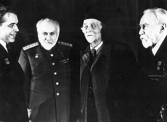 Сергей Иванович Вавилов (крайний слева) после избрания президентом Академии наук СССР. Слева направо академики: Л. А. Орбели, Н. Д. Зелинский, Д. Н. Прянишников. 17 июля 1945.