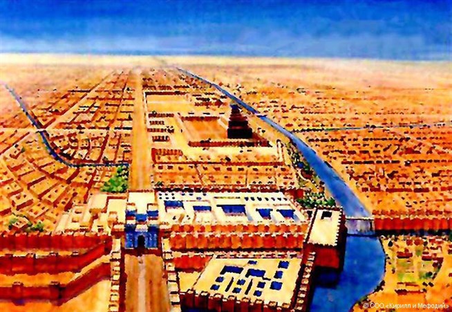 Реконструкция Вавилона. Самым крупным из всех городских поселений Месопотамии был Вавилон. В 7-6 вв. до н. э. город возвышался на прямоугольной площади, обнесенный двойной кирпичной стеной с башнями и башен и восемью укреплёнными воротами. Улицы образовывали прямоугольную сеть. Основной улицей была «дорога процессий», тянувшаяся через весь город от наиболее важных северных «ворот Иштар» до храма Мардука. При Навуходоносоре в Вавилоне были построены укрепленные дворцы и знаменитые «Висячие сады Семирамиды» — одно из семи чудес света.