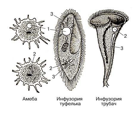 Сократительные вакуоли у простейших: 1 – в состоянии наполнения; 2 – в состоянии сокращения; 3 – приводящие каналы вакуоли.