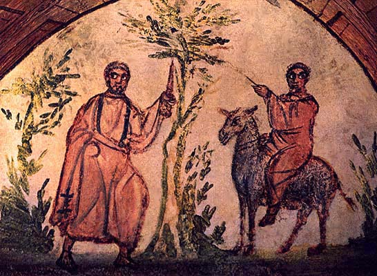 Валаам и ангел, преграждающий ему дорогу. Фреска 4 в. Катакомба на Виа Латина. Рим.