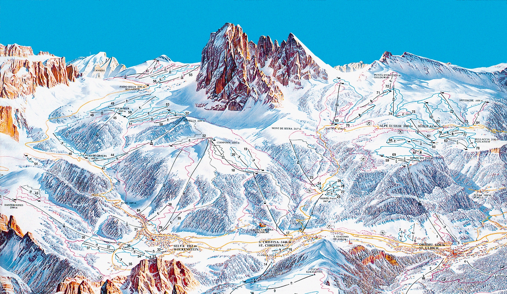 Схема горнолыжных трасс курорта Валь-Гардена в Италии.