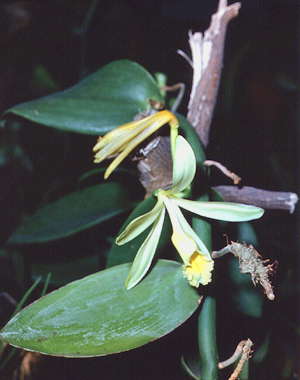 Ваниль плосколистная. Часть стебля с цветком, завязью, листьями и воздушными корнями.