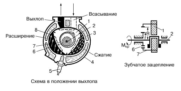 Двигатель Ванкеля: 1 – ротор; 2 – вал; 3 – водяное охлаждение; 4 – корпус; 5 – свеча зажигания; 6 – шестерня; 7 – зубчатое колесо; 8 – цилиндр.