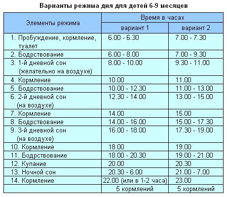 Варианты режима дня для детей от 6 до 9 месяцев.