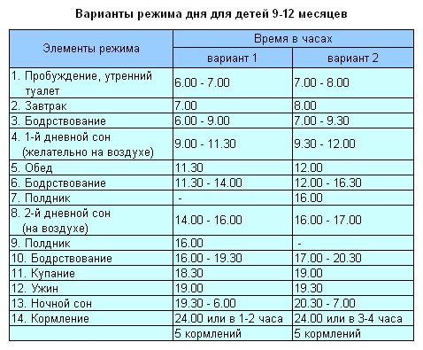 Варианты режима дня для детей от 9 до 12 месяцев.