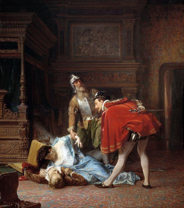 Карл Федорович Гун (1830-1877). Сцена из Варфоломеевской ночи. 1870 год. Холст, масло. Третьяковская галерея.