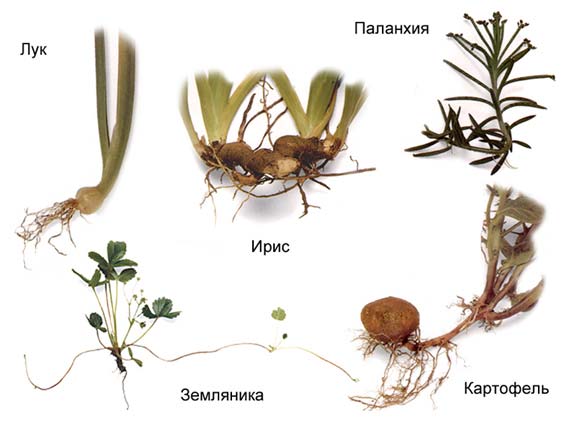 Вегетативное размножение осуществляется при помощи вегетативных органов (стеблевые черенки у ивы ломкой; деление куста у полыни; отводки у ели; корневые отпрыски у осины) и их видоизменений (корневище, клубни, луковицы, усы).