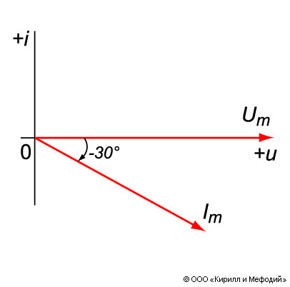 sin2πft, где i, u — мгновенные значения величин, Im, Um — их амплитуды, f — частота, t — время, 30° — начальная фаза при t = 0.