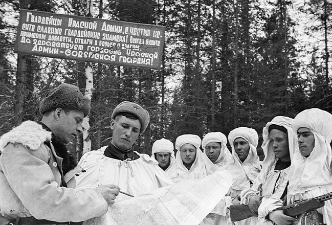 Разведчики Двадцать третьей гвардейской дивизии получают боевое задание. Карельский фронт. 1942 год.