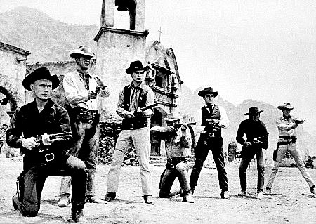 Ю. Бриннер, С. Маккуин, Х. Бухгольц, Р. Вон, Ч. Бронсон, Дж. Коуберн, Б. Декстер в фильме «Великолепная семерка».