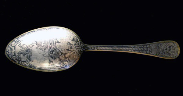 Десертная ложка, выполненная в технике великоустюжской черни. Завод «Северная чернь».
