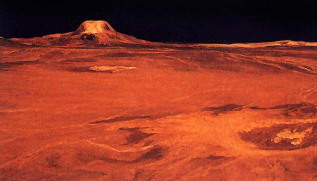 Радиолокационное изображение участка поверхности Венеры, переданное американским космическим аппаратом «Магеллан». На горизонте слева видна гора Гула (ударный кратер поперечником несколько сотен км и высотой около 3 км), справа внизу — ударный кратер Куниц (поперечник около 50 км).