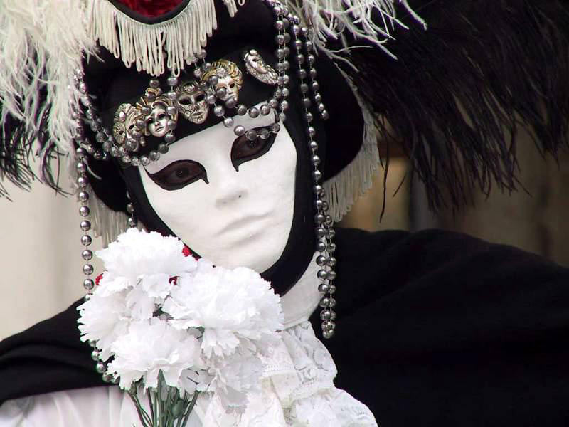 Венеция. Белая маска и черный широкий плащ (tabarro) в сочетании c шелковой накидкой (bauta) и треугольной шляпой (tricorno) являются частями одного из самых популярных венецианских карнавальных костюмов.