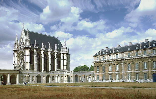 Справа — венсенский замок французских королей (14-16 вв.), служивший их резиденцией до постройки Версаля. С замком связано множество событий французской истории: здесь умерли Людовик X, Филипп V, Карл IV и Карл IX, а также английский король Генрих V и кардинал Мазарини. Начиная со времени правления Людовика XIII (1601-43) замок стал государственной тюрьмой, среди самых знаменитых узников которой — принц Конде (Великий Конде), кардинал де Рец, Дидро, Мирабо. В замке по приказу Наполеона был застрелен герцог Энгиеннский (1804). После революции 1789 замок использовался в военных целях. После 1930 министерство обороны освободило замок, и началась реставрация, прерванная Второй мировой войной. Во время оккупации замок находился на захваченной немцами территории и сильно пострадал. Слева — дворцовая церковь в готическом стиле (закончена в 1552) со стороны главного фасада украшена окном-«розой».