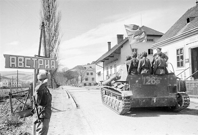 Советская боевая техника пересекает австро-венгерскую границу. 1945.