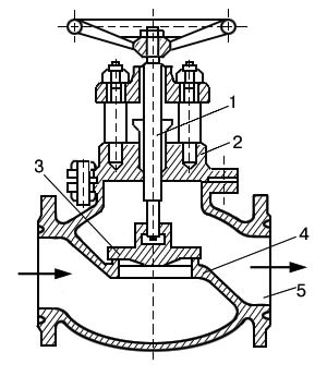 Трубопроводный вентиль: 1 — шпиндельвинт; 2 — крышка с сальником; 3 — клапанная крышка; 4 — седло клапана; 5 — корпус.