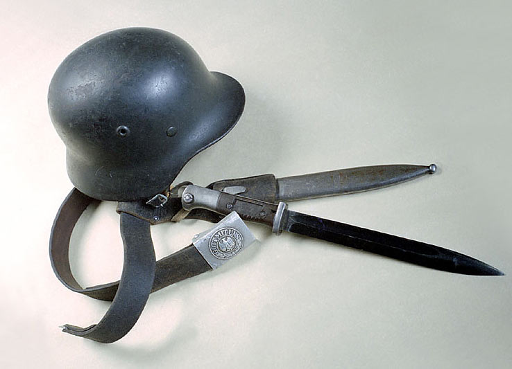 Предметы экипировки солдата вермахта: каска, штык к винтовке образца 1935 г., ремень с надписью «С нами Бог».