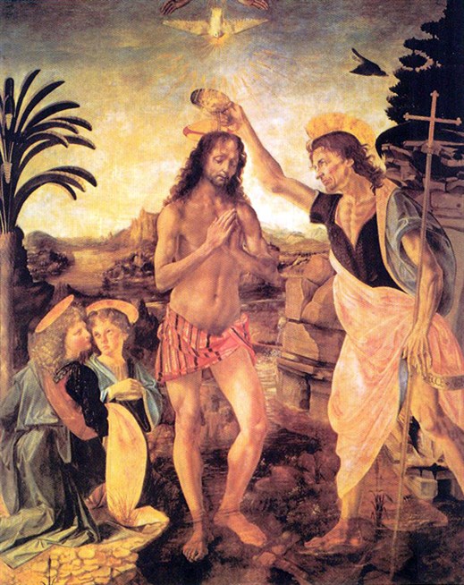 Андреа Верроккио. Крещение Христа. Около 1470 года. Дерево, темпера, масло. Уффици, Флоренция. В работе над этой картиной принимал участие ученик Верроккио — Леонардо да Винчи.