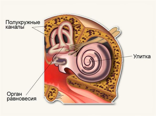Расположение вестибулярного аппарата и улитки во внутреннем ухе.