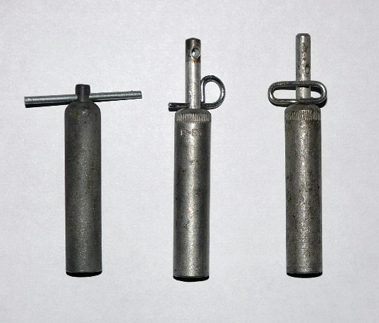 Минные универсальные взрыватели (МУВ): со шпилькой взведения (слева), с р-образной чекой (в центре), т-образной чекой (справа).