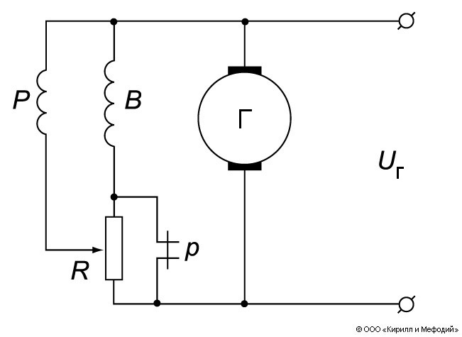 Схема простейшего вибрационного регулятора напряжений : Р — обмотка реле; В — обмотка возбуждения; Г — генератор; U