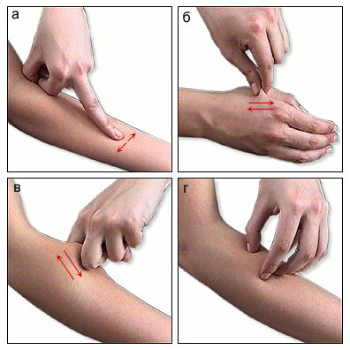Вибрация: а) средним пальцем; б) кожной складки; в) прерывистая вибрация; г) кончиками всех пальцев.
