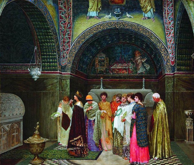 Василий Сергеевич Смирнов (1858-1890). Утренний выход византийской царицы к гробницам своих предков. 1889-1890 годы. Холст, масло. Третьяковская галерея.