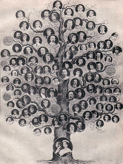 Королеву Викторию называли «бабушкой Европы». На плакате изображены 9 ее детей, 40 внуков и их семьи. 1901.