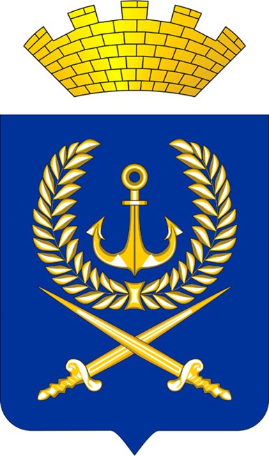 Герб Вилючинска. В лазоревом поле якорь, окруженный разомкнутым вверху лавровым венком, внизу два обнаженных морских кортика накрест; все фигуры золотые. Щит увенчан муниципальной короной.