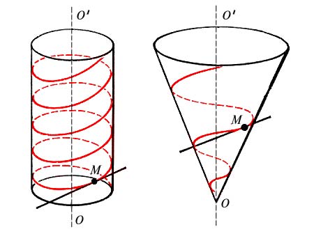 Винтовая линия. Ее можно задать как кривую, описываемую точкой M, которая вращается вокруг неподвижной оси OO' и одновременно перемещается поступательно с постоянной скоростью вдоль этой оси (I). Касательная в любой точке М винтовой линии составляет постоянный угол с осью OO' (I и II).