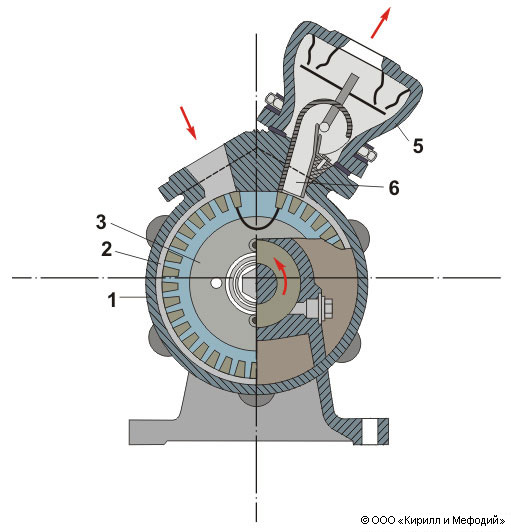 Вихревой насос закрытого типа: 1 — корпус; 2 — канал; 3 — рабочее колесо; 5 — воздухоотделитель; 6 — отверстие для подвода и отвода жидкости.
