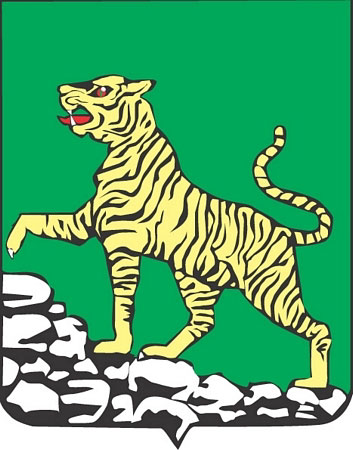 Герб Владивостока, утвержденный 1 ноября 2001 года. В зеленом поле золотой тигр с червлеными (красными) глазами и языком, поднимающийся по скалистому серебряному склону, подняв переднюю правую лапу.