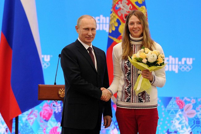 Президент России Владимир Путин награждает сноубордистку Алену Заварзину медалью ордена «За заслуги перед Отечеством». 2014 год. Фото: пресс-служба Президента России, kremlin.ru