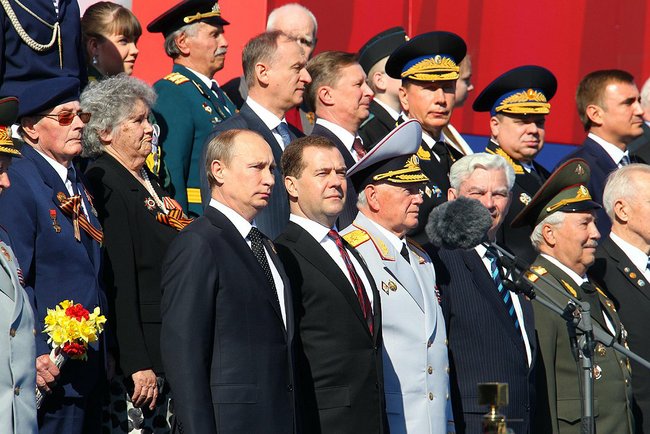 Владимир Путин и Дмитрий Медведев на военном параде в ознаменование 68-й годовщины Победы в Великой Отечественной войне, 2013 год. Фото: kremlin.ru