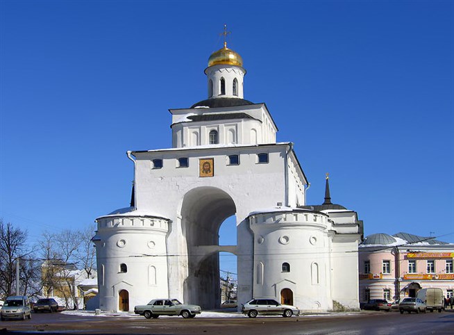 Владимир. Золотые ворота. 1158-1164 годы. Единственные сохранившиеся из белокаменных ворот, входивших в систему оборонительных сооружений города. Арка в старину замыкалась дубовыми воротами, обитыми золоченой медью. Надвратная церковь (Положения риз Богоматери) обновлена в 1469 В. Д. Ермолиным, в 1810 перестроена.