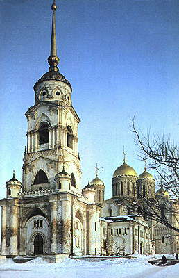 Успенский собор во Владимире, построенный (из белого тесаного камня) по заказу князя Андрея Боголюбского в 1158-60, был главным (кафедральным) храмом Северо-Восточной Руси. Первоначально он имел вид шестистолпного трехнефного одноглавого здания с тремя притворами и башнями. При князе Всеволоде Большое Гнездо собор был перестроен: разобранные притворы и башни были заменены галереями, вместо одноглавного собор стал пятиглавым. Будучи одним из величайших творений русского зодчества, собор послужил образцом для более поздних русских храмов. В интерьере частично сохранились росписи 12, начала 13 в. В 1408 собор был расписан Андреем Рублевым и Даниилом Черным (отдельные фрагменты сохранились). Выполненные этими иконописцами для иконостаса собора образы деисусного чина находятся в Москве (Третьяковская галерея) и Санкт-Петербурге (Русский музей). Колокольня построена в 1810, автору проекта удалось добиться интересного архитектурного сочетания, свидетельствующего о его тонком вкусе.